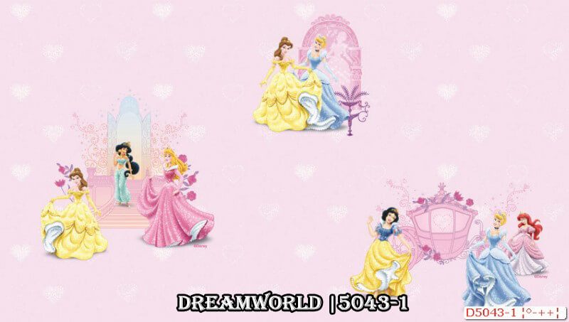 Nếu bạn đang chưa tìm ra mẫu giấy dán tường nào cho các bé gái thì đây chắc chắn là mẫu giấy dán tường phù hợp, 5043-1 với các họa tiết nhân vật hoạt hình công chúa trên nền hồng, điểm thêm các hình tim mờ.