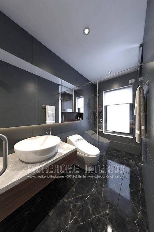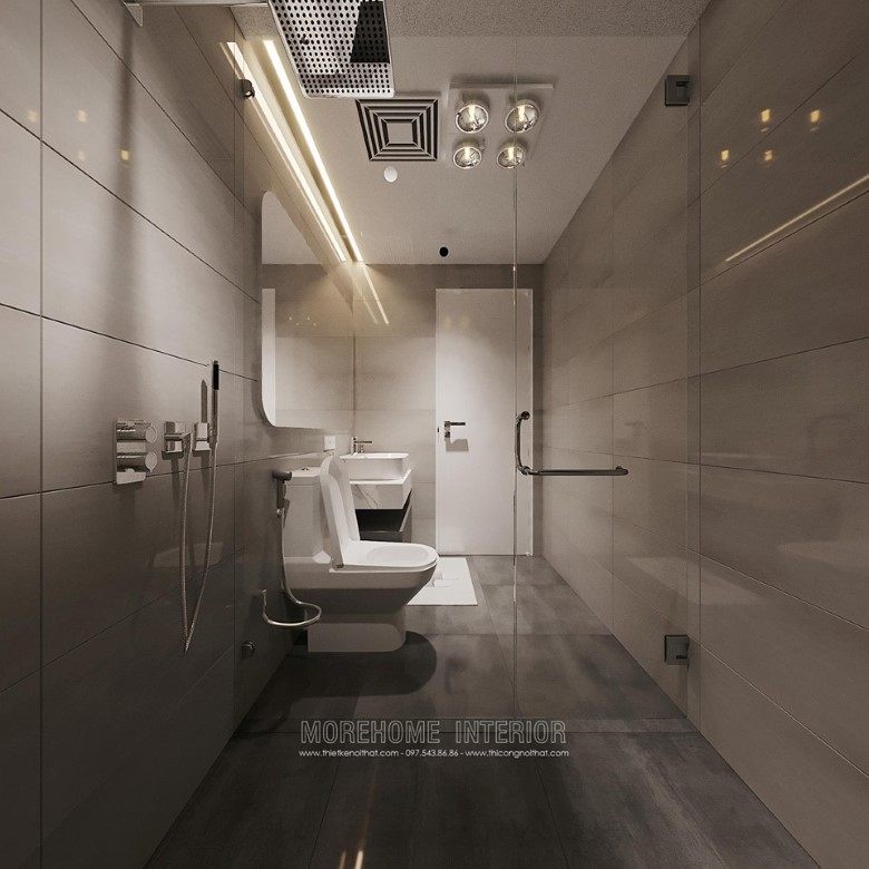 Vách tắm kính 180 độ ngăn giữa 2 khu vực phòng tắm đứng và khu vực khác trong phòng để không bị ảnh hưởng gây tới quá trình sử dụng sinh hoạt của gia chủ.
