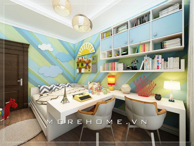 Để làm cho phòng ngủ của con trai đầy ấn tượng, bố trí nội thất nhà phố với giấy dán tường họa tiết màu xanh tươi mới phù hợp với sở thích của trẻ.
