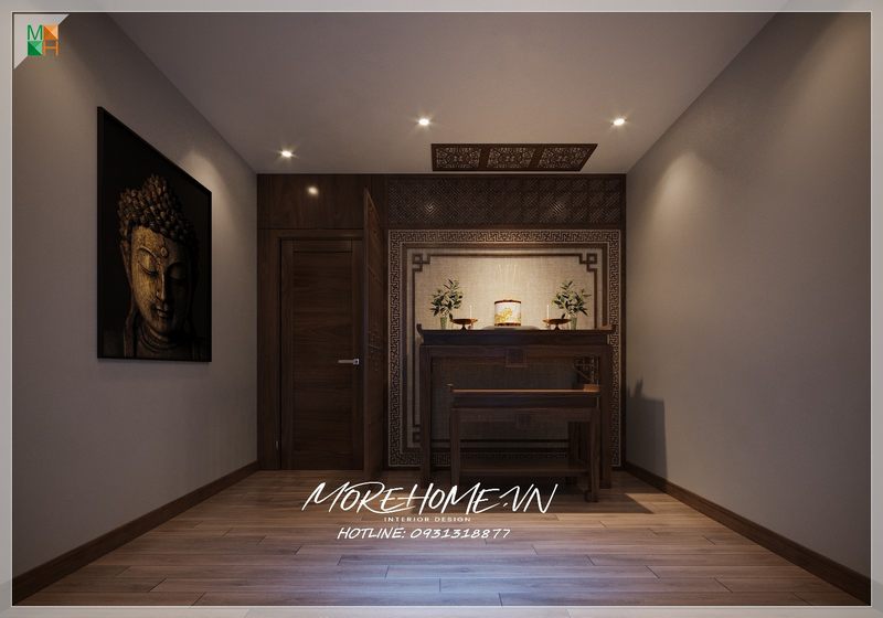 Phòng thờ được trang bị nội thất gỗ tự nhiên với gam màu vàng nhẹ nhàng, góp phần tạo nên một không gian an nhiên, linh thiêng và thư thái cho gia chủ.