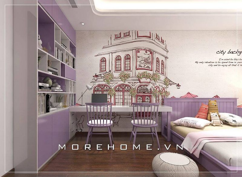 Góc học tập được bố trí gần phòng ngủ, kết hợp với kệ sách gỗ công nghiệp đa năng và các tiện nghi, giúp không gian con trở nên rộng rãi và thoáng mát.